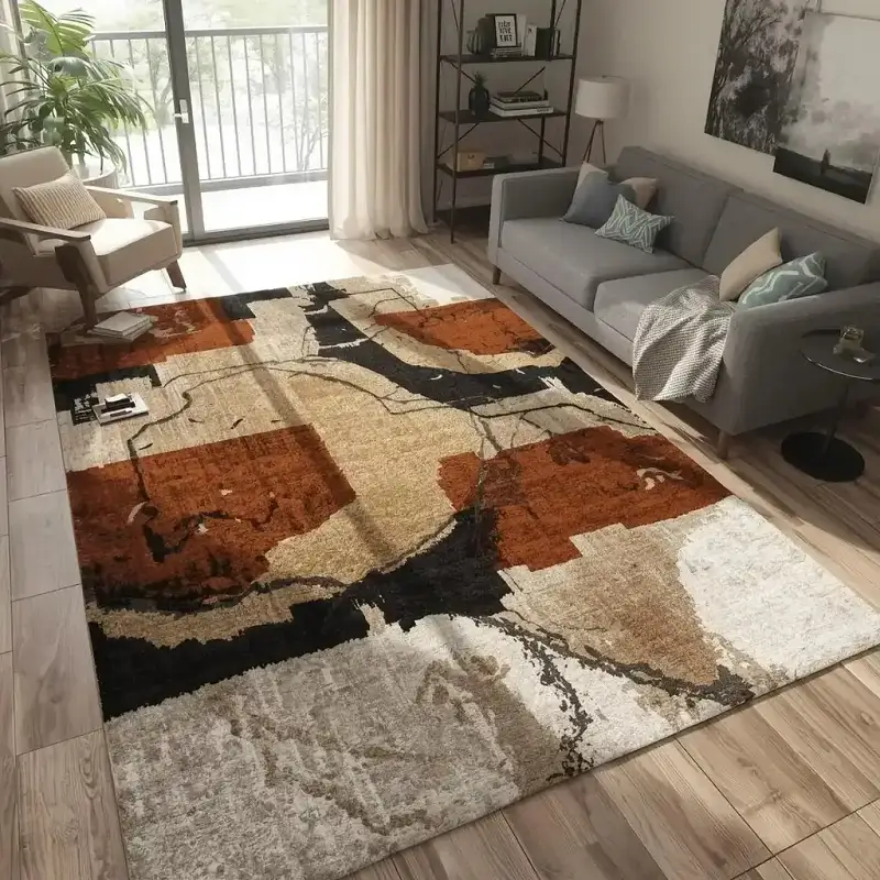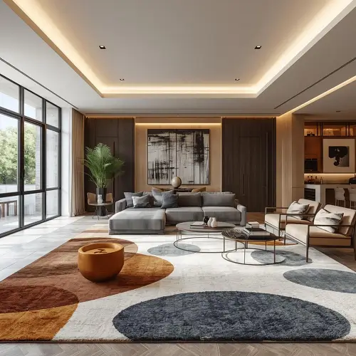 Abstract modern rugs enhance visual appeal, define seating areas, and add comfort while complementing contemporary furniture and open-plan interiors.